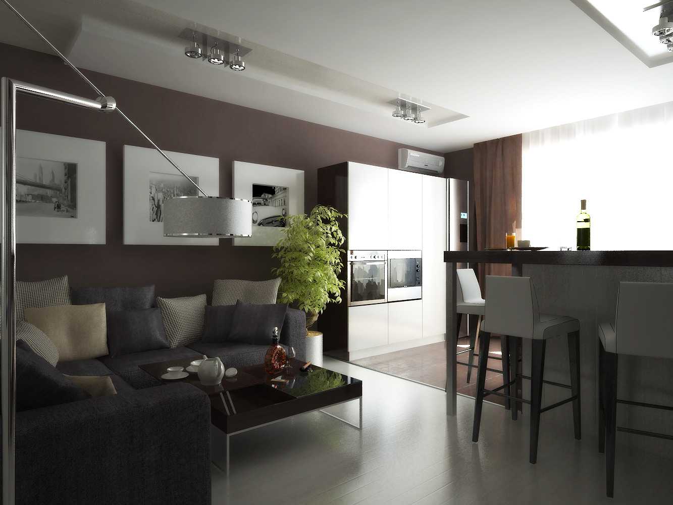 - Экономия на технике. Теперь не нужно приобретать два телевизора: для гостиной и кухни. Хватит одного большого телевизора, расположенного в зоне отдыха.
