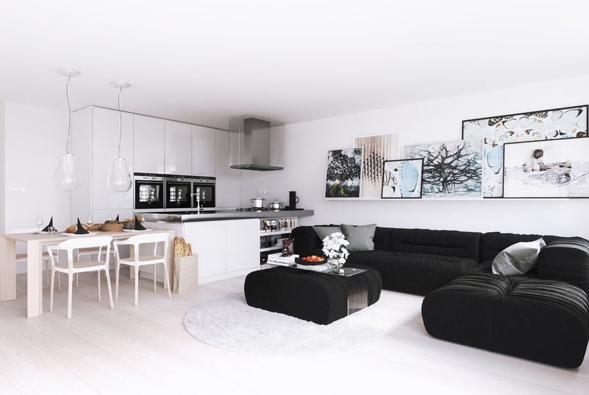 В дизайнерских проектах все чаще используется чистый белый цвет, который становится основой любой композиции. Он прекрасно расширяет пространство, делает его светлым и позитивным. Но оформить гостиную с кухней вместе в один оттенок, тем более столь искрящийся, будет плохой идеей.