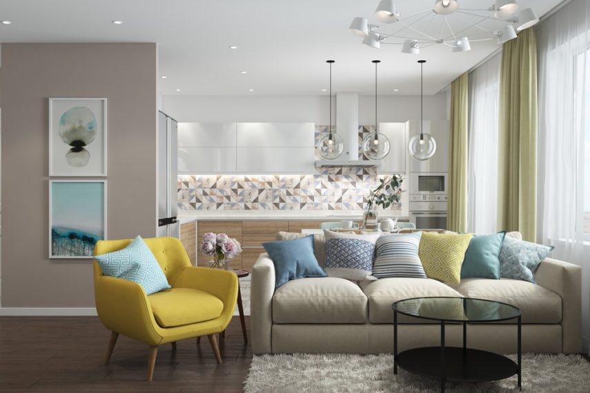 Есть много способов, как отделить кухню от гостиной. Вначале нужно определить какое место вы хотите выделить сильнее. Разделить комнаты можно раздвижной конструкцией, островом или барной стойкой.