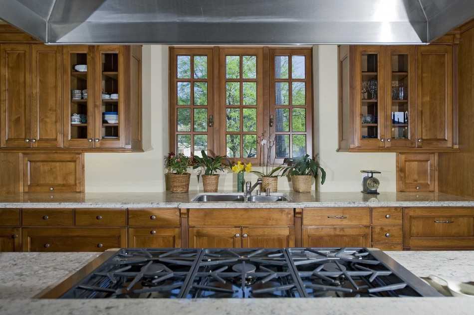 Стиль подходит для обустройства планировки кухни в частном доме. К его основным чертам относится: