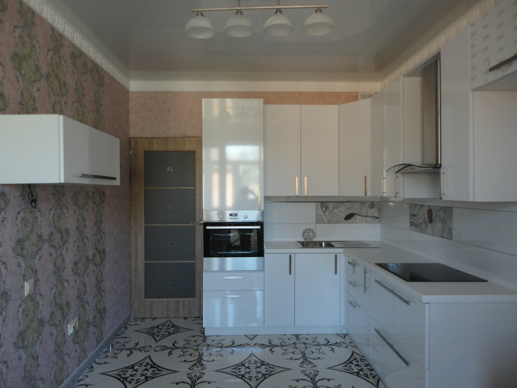 На фото – натяжные потолки с мебелью на всю высоту кухни.