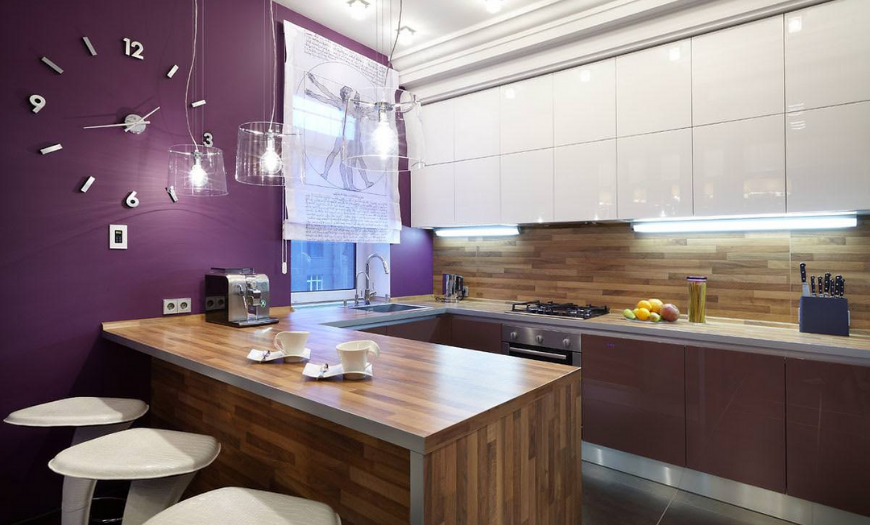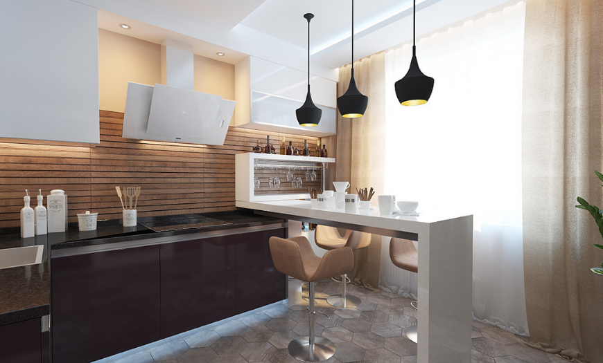 Размер обеденного стола зависит от того, сколько человек проживает в квартире. Если обеденная зона предназначена для быстрого перекуса, следует установить стильную барную стойку со складными стульями.