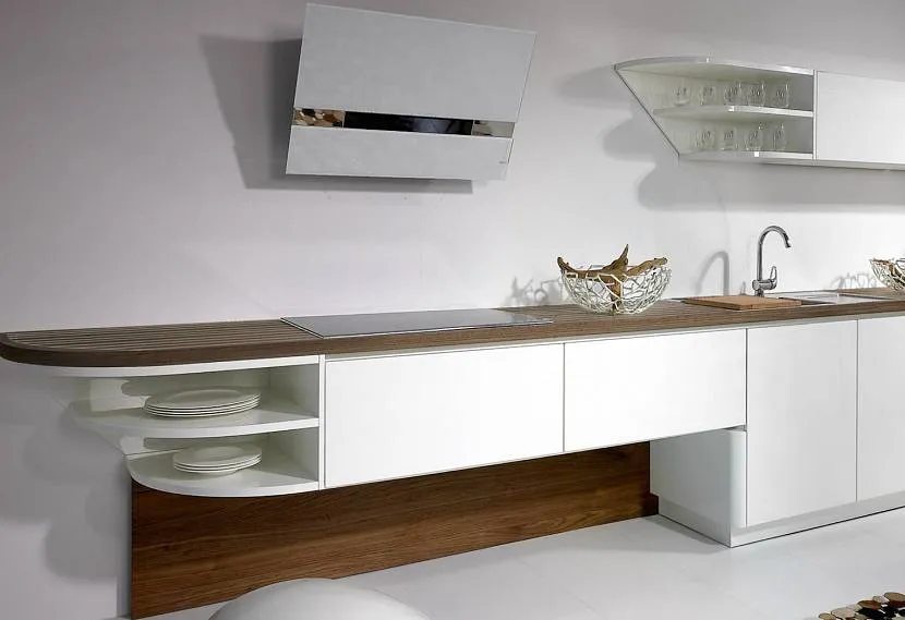 При использовании частичного верхнего гарнитура вытяжку над подвесными нижними модулями можно оформлять в виде удлиненной конструкции. Эта поверхность сыграет роль полки. Вместе с «парящим» фасадом визуально удлинит пространство.
