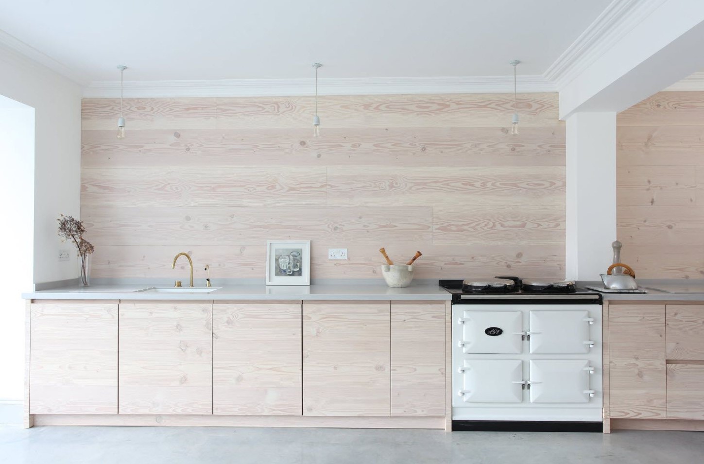 Навесные конструкции из натурального дерева на белой стене в кухне без верхних навесных шкафов