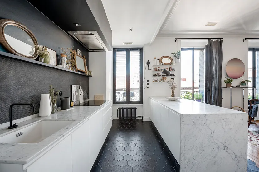Кухня оформлена в черно-белых тонах. Остров квадратный и полностью повторяет очертания помещения. Напольное покрытие выполнено из черного кафеля, имитирующего мрамор. Столешница и мойка изготовлены из черного мрамора. Фасады гарнитура имеют белое глянцевое светоотражающее покрытие.