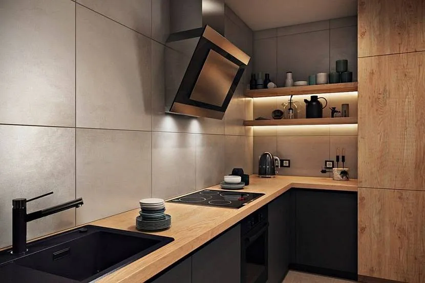Рассмотрите дизайн кухни с вытяжкой без шкафчиков наверху