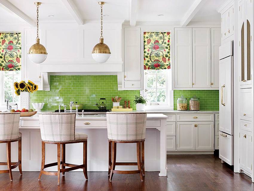 | Зеленый | Ассоциативная связь зеленых оттенков с природой способствует пробуждению здорового голода, который можно утолить с помощью овощей. Длительное нахождение в кухне способствует более полноценному усвоению питательных веществ, поступивших в организм с растительной пищей. |