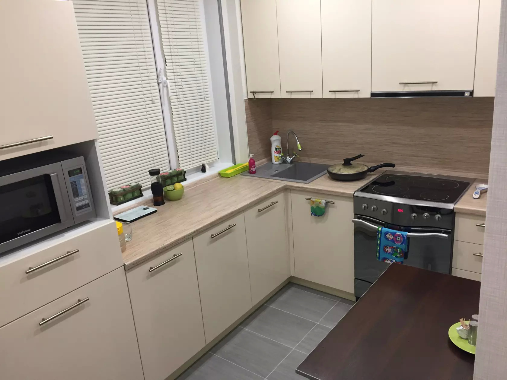 Для отделки стен лучше всего использовать штукатурку, краску либо моющиеся обои. Кухонный гарнитур необходимо выбирать современный, изготовленный из синтетических материалов (пластика, стекла, искусственного камня, металла). Пол стоит сделать светлым, для этого прекрасно подойдет ламинат.