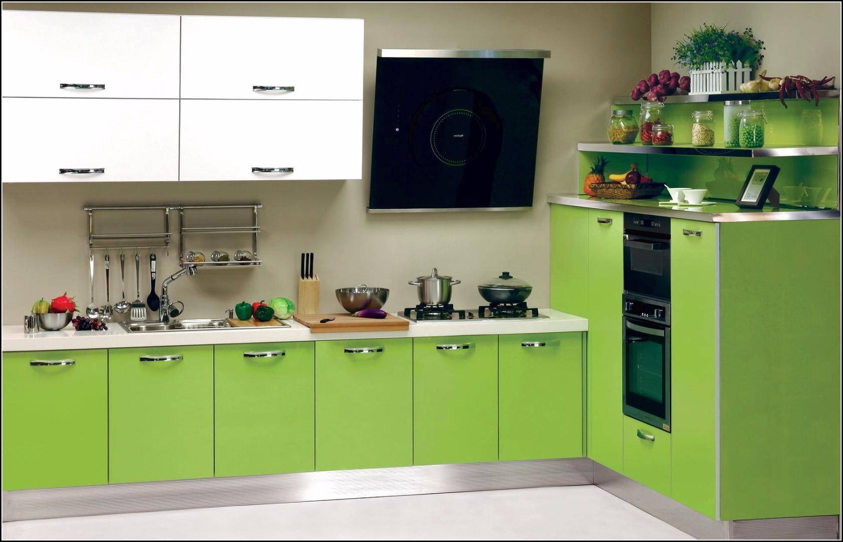 Хай-тек — это черно-салатные гарнитуры, они эффектны в белой или бежевой кухне. Если добавить белый стол и стулья оригинальной формы и новейшую технику, получится идеальный модный дизайн.