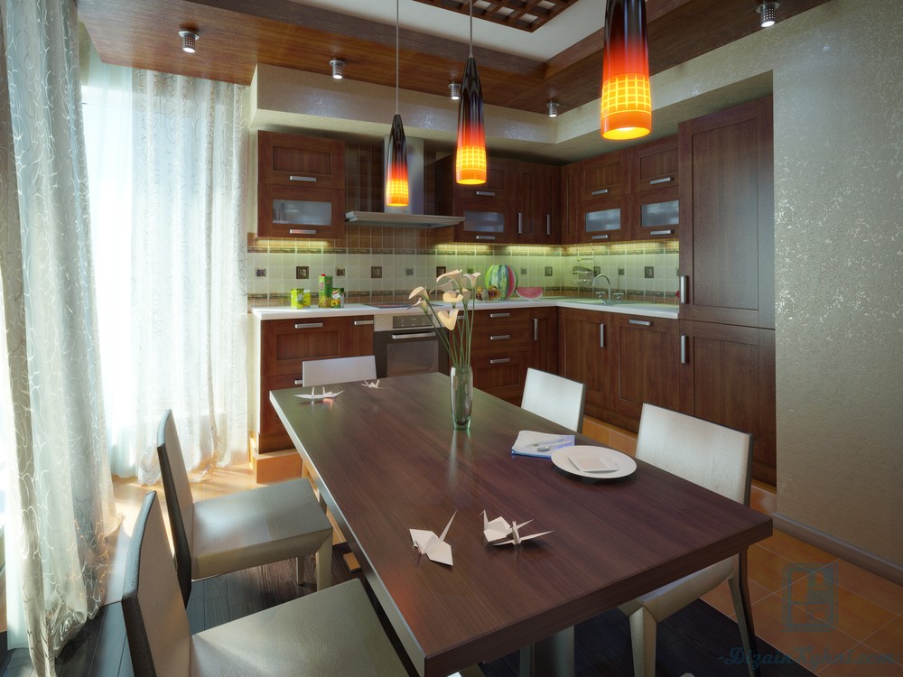 Цвет потолка зависит от того, как оформлена вся кухня. Например, если вы выбрали фисташковый гарнитур, потолок лучше сделать бежевым или белым. Окрасить же его в цвет ореха можно, если вы отдали предпочтение белой мебели. Кроме того, учитывайте цвет стен на кухне: их оттенок должен гармонировать с тоном потолка.