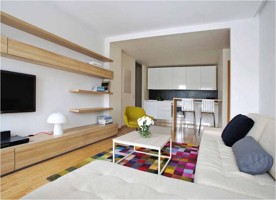 Из помещения, в котором планируется организовать гостиную, спальню и кухню, убирают перегородки, разбивают его на зоны с помощью расстановки мебели и оформления стен. В кухонной зоне их отделывают плиткой. В остальном помещении стены окрашивают или клеят на них обои в тон плитки. Здесь организуют гостиную или обеденную зону. В углу устанавливают диван, на противоположной стене – телевизор. На диване можно отдыхать и спать. Это позволяет сэкономить место.