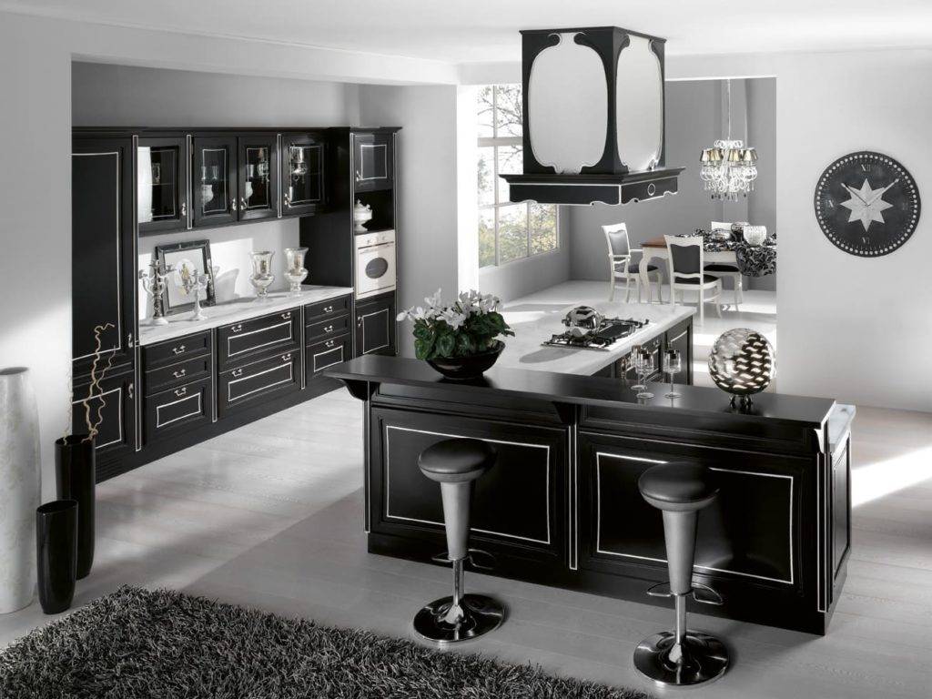 Отделить кухню можно посредством стеклянных перегородок в черных рамках или деревянной колонны с балкой на потолке. Другой вариант разделения — это барная стойка, но исключительно из дерева со столешницей натурального цвета.