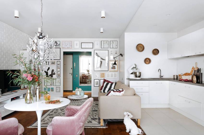 Первое у нас уже имеется – ведь гостиная, совмещенная с кухней, как и любая объединенная площадь – это уже относительно большое пространство .