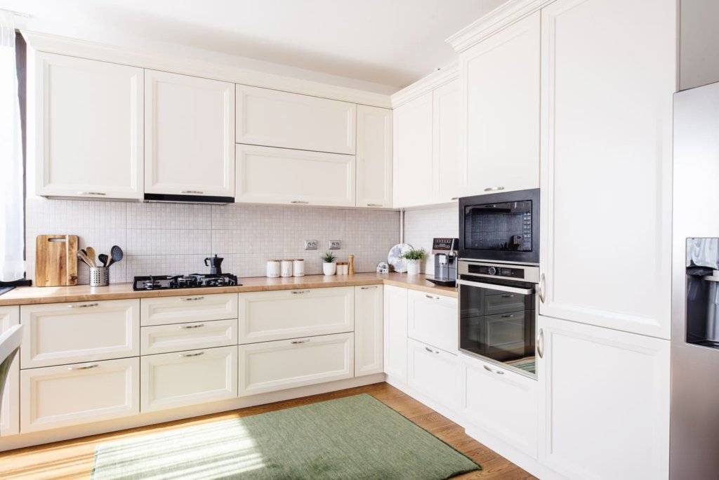 - Цвет фасадов. Наиболее популярный – белый. Также часто используются фасады под светлое дерево, в медово-золотистых и коньячных оттенках. Допускается контрастная столешница (как правило, из массива дерева).