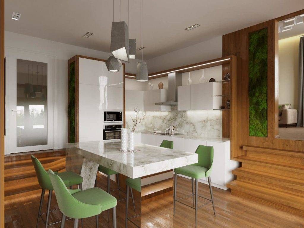 Расставлять мебель в кухне гостиной следует по методу контраста. Например, если Ваш кухонный гарнитур в скандинавском стиле белого цвета, то он отлично впишется в область, где напольное покрытие выполнено из древесины. Чтобы пол и гарнитур отлично сочетались, можно использовать открытые полки из дерева, либо древесную рабочую поверхность в гарнитуре.