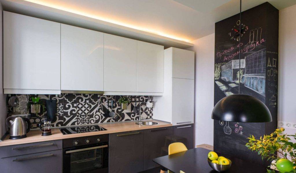 В качестве яркого акцента сгодится темного цвета столешница обеденного стола или рабочей зоны, декор фартука, который будет бросаться в глаза. Фартук обычно отделывают плиткой, оформляют под кирпич или выкладывают панели под дерево. Иногда встречается мозаика или стеклянное интерьерное решение.