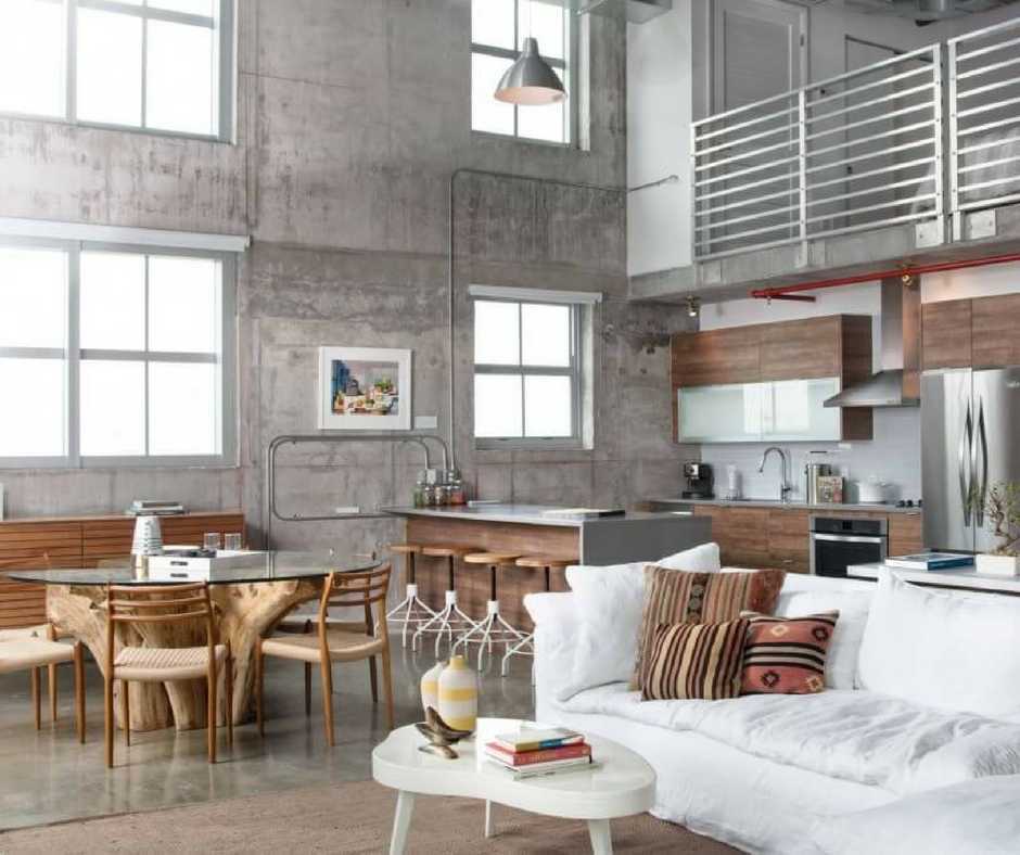 Еще один обязательный момент – хотя бы несколько небольших зон, стилизованных под промышленное здание или не до конца законченный ремонт. Такими элементами могут выступать нарочито оставленная штукатурка, кирпичная кладка, полы из досок, бетонные участки пола или стен.