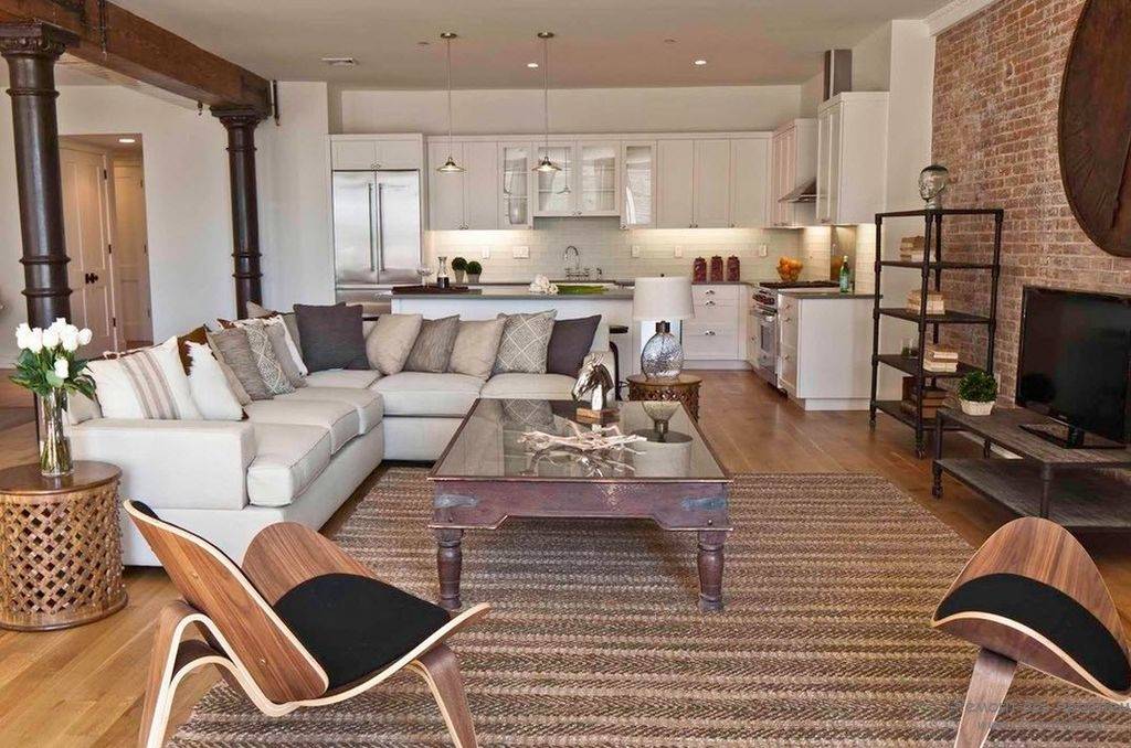Оформлять кухню совмещенную с гостиной в промышленном стиле лофт лучше всего в просторном помещении с высоким потолком и открытым пространством. В полной мере данное требование может быть соблюдено в случае оформления кухни-гостиной в стиле лофт в частном доме. В типовых городских квартирах, где потолки значительно ниже, визуально добавить простора можно за счет стеклянных прозрачных элементов.