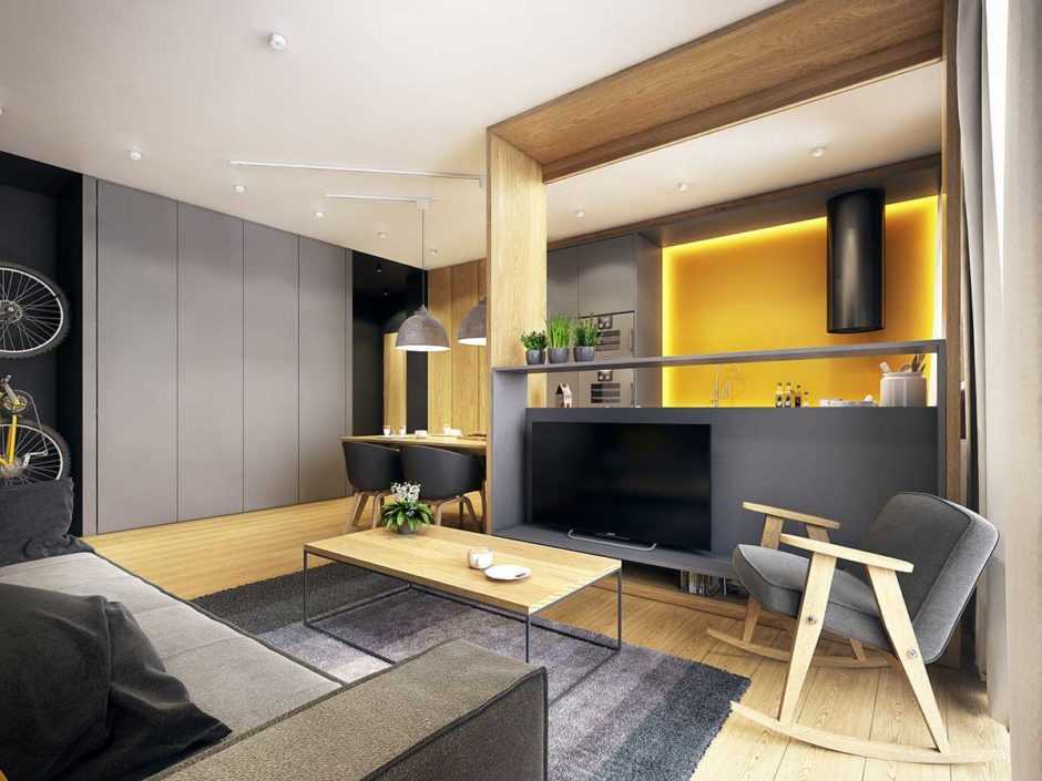 Современная кухня-гостиная – это помещение, где нет ничего лишнего: минимум декора, максимум света и свободного пространства. Поэтому для маленькой комнаты это наиболее подходящий вариант оформления.