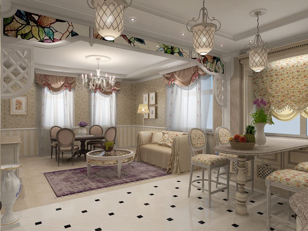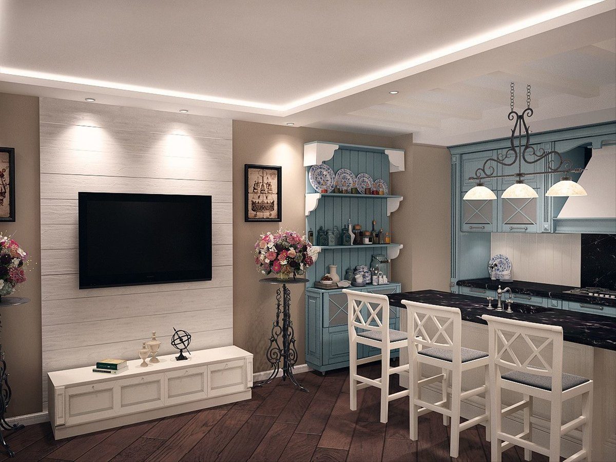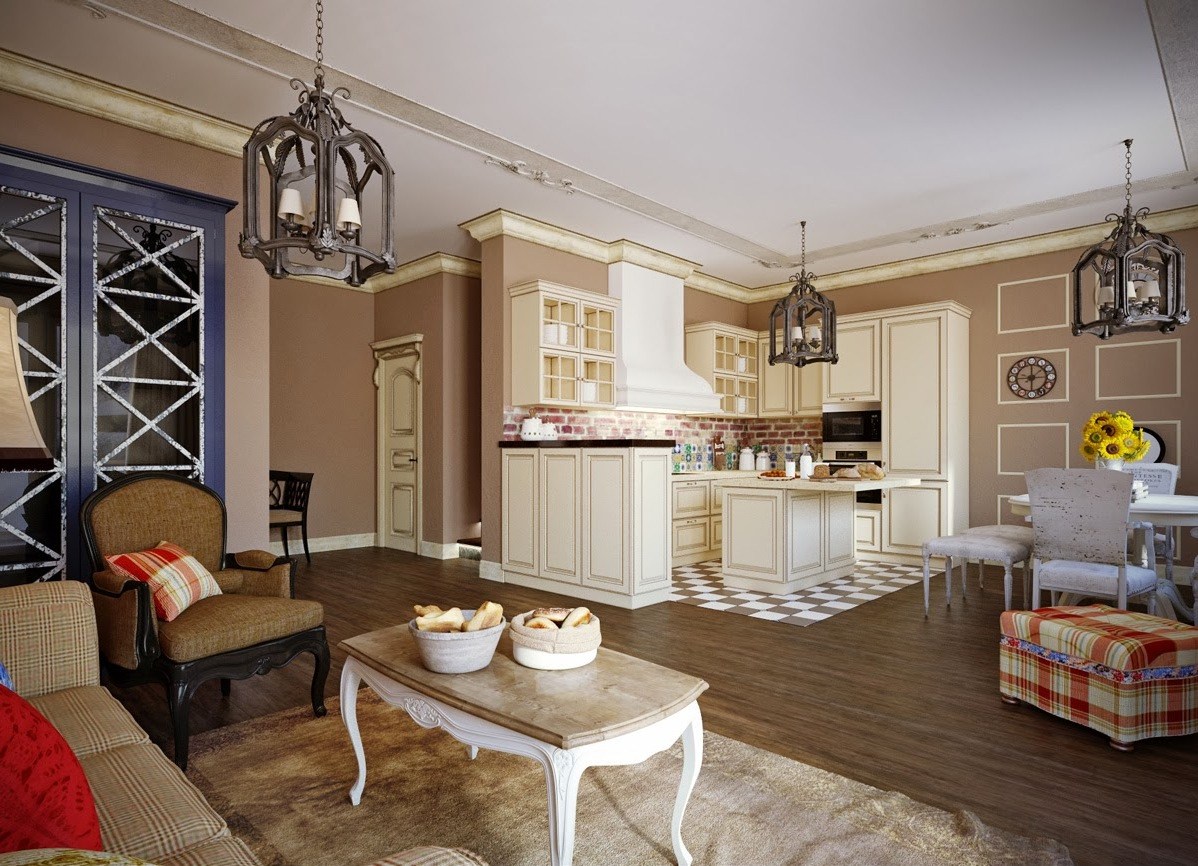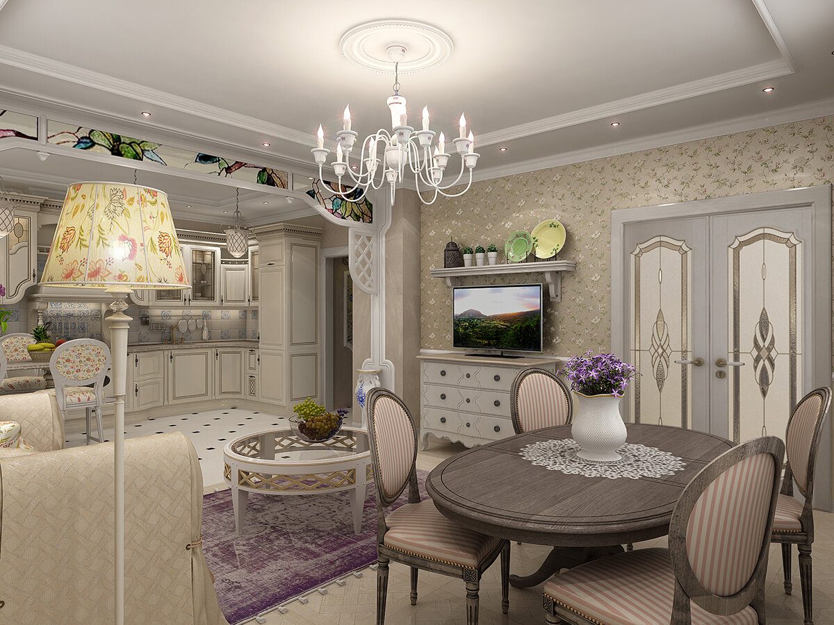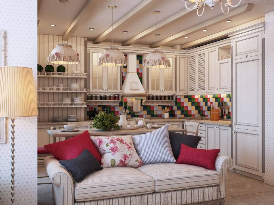 В кухнях, совмещенных с гостиными стиль прованс очень часто сочетается с классикой