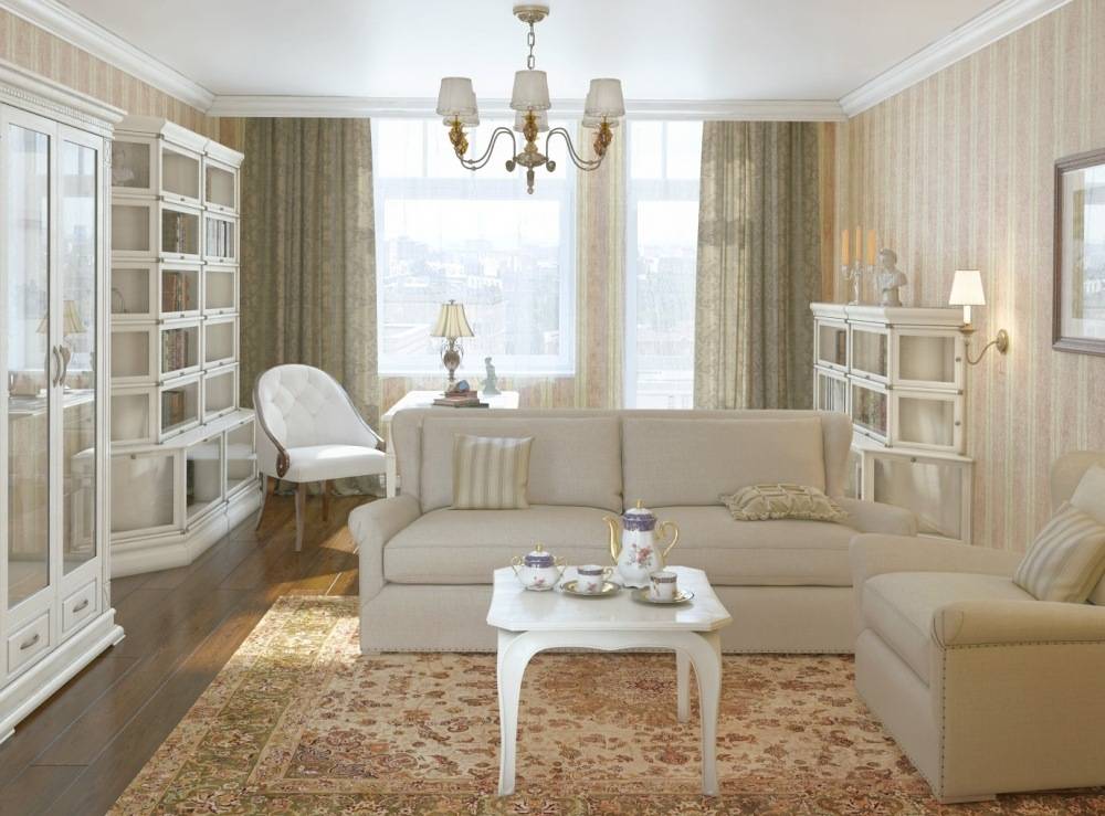 Традиционная гостиная включает в себя диван, несколько кресел, столик, стенку и, если место позволяет, пуфики или тумбочки. Такая меблировка предполагает, что кроме просмотра телевизора, вы будете проводить время еще за чтением книг, а может и вязанием.