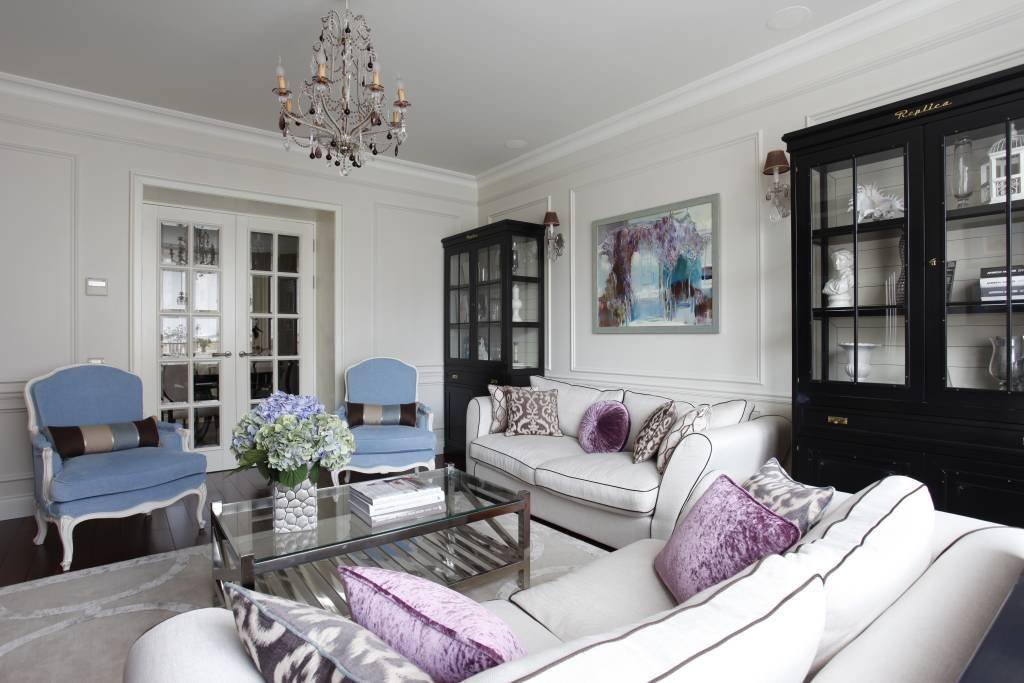 Интерьер городской квартиры выдержан в бело-голубой цветовой гамме. Верхние части дверей застеклены и украшены декоративной раскладкой, что характерно для французского кантри. В роли декоративных акцентов выступают – фальш-камин со свечами, текстиль с цветочным и полосатым орнаментом, зеркало в спальне и зелень в разноцветных горшках в лаунж-зоне на балконе.