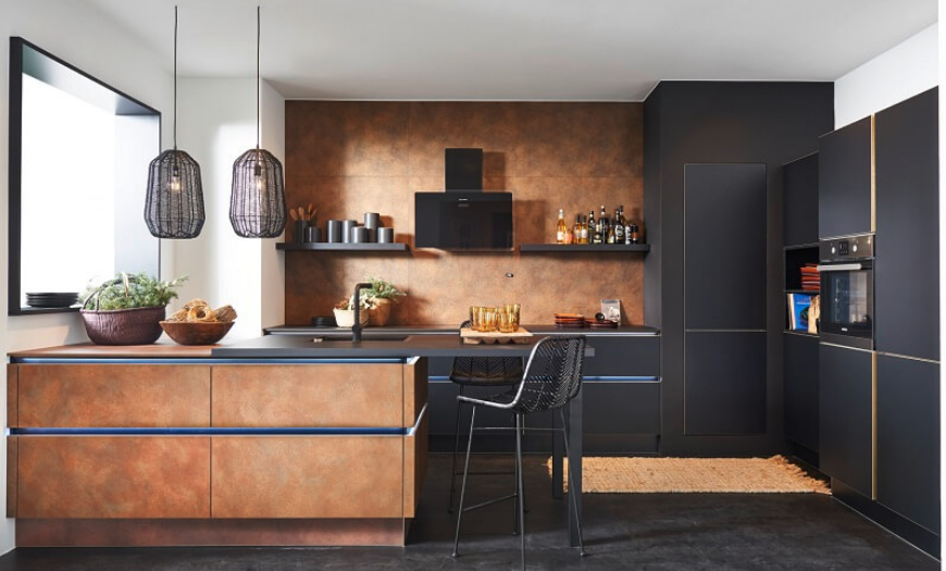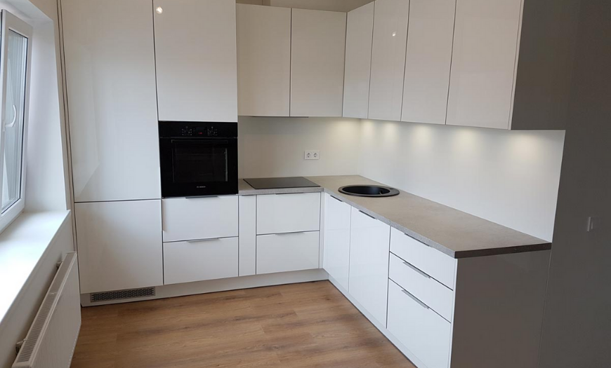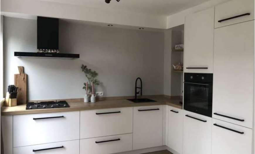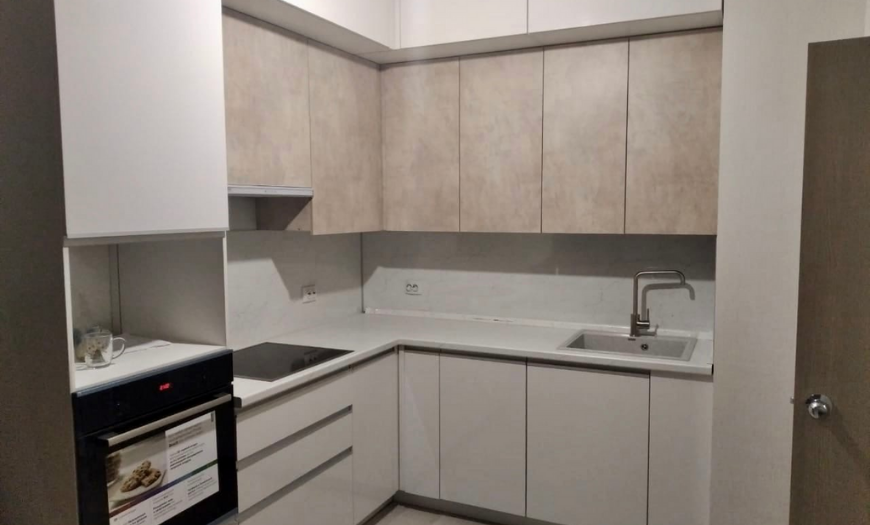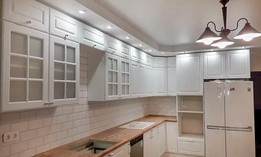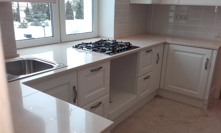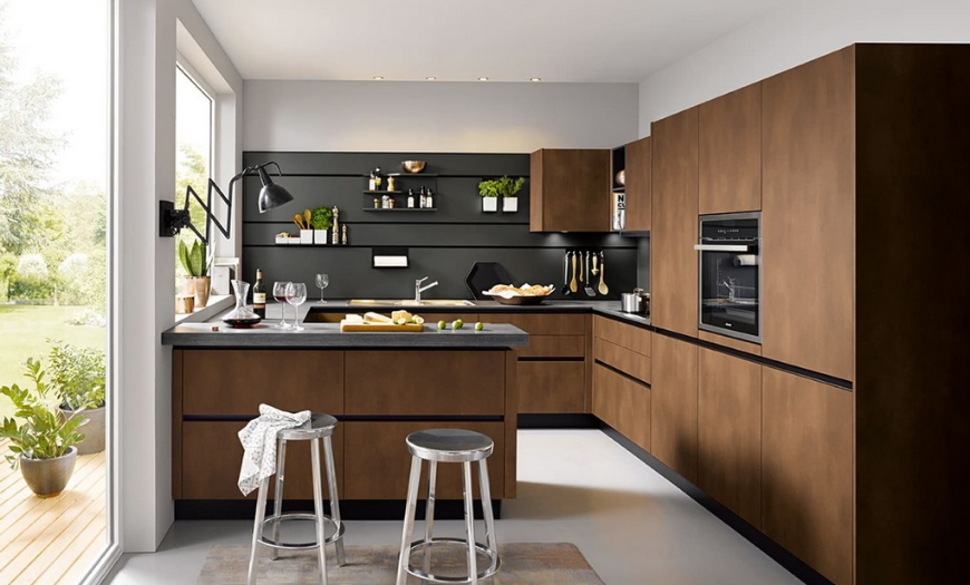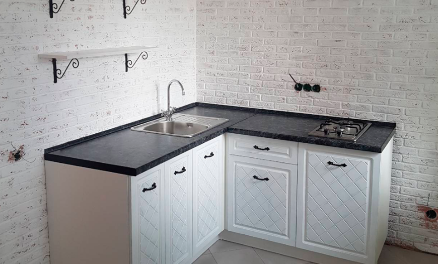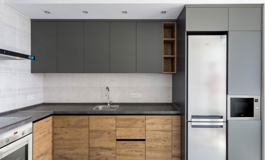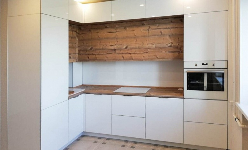 - Угловая или L-образная, преимущество которой в том, что за счет угла вы увеличиваете площадь рабочей поверхности и зоны хранения. Одно “но” – этот способ планировки не подходит длинным узким помещениям;