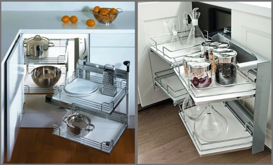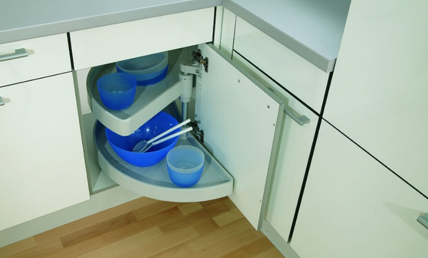 Некоторые владельцы угловых гарнитуров неправильно организуют пространство для хранения вещей. Поэтому дизайнеры интерьеров разработали оригинальные и практичные идеи для решения таких неприятностей. Существуют различные «умные» системы, в которых каждый свободный сантиметр используется грамотно. Например, можно установить в углу выдвижные конструкции и вращающиеся секции-карусели.