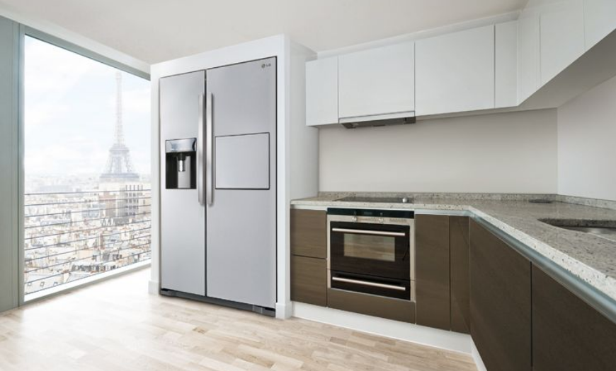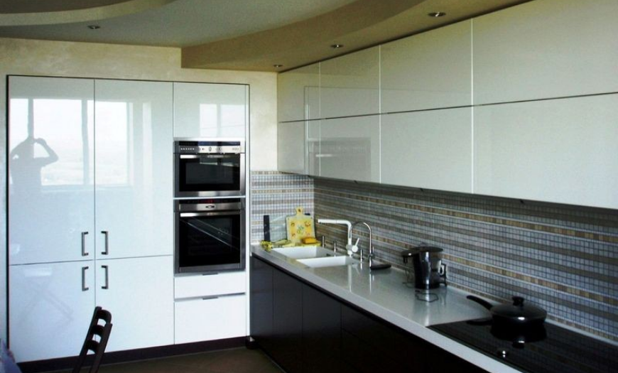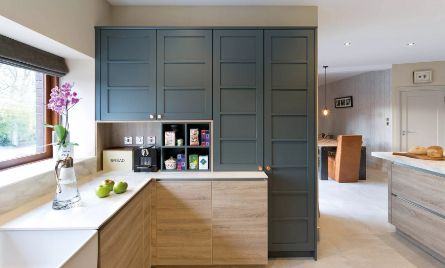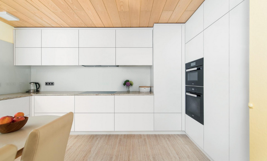 По обеим сторонам углового комплекта можно поставить высокие шкафы для встроенного кухонного оборудования. Такой способ планировки является неплохой альтернативой для фартука, разделяющего ряды шкафов. Высокие модули делаются отдельно стоящими, либо интегрированными в нишу.