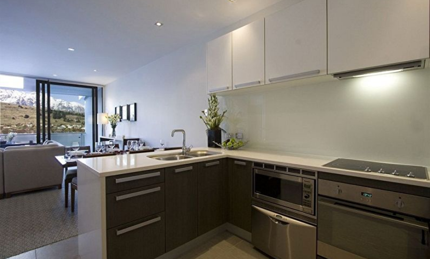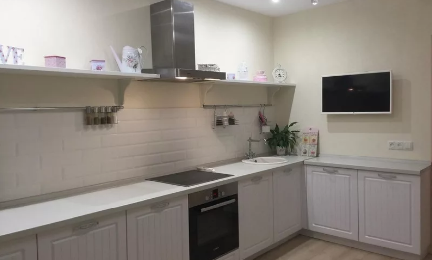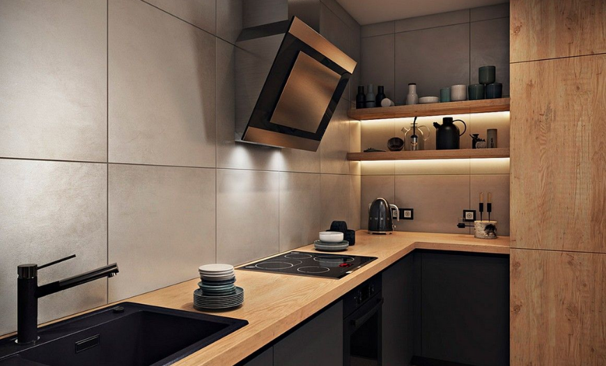 Чтобы сделать оформление небольшой кухни лаконичным, возле одной стены лучше не ставить шкафы и мебель для хранения утвари. Эту зону следует отвести под вытяжку и полки с оригинальным дизайном. Кроме того, можно повесить на пустой стене телевизор.