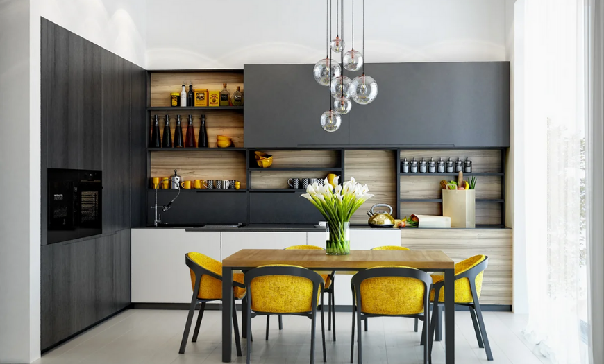 Осветительные приборы на кухне, совмещенной с гостиной, также играют роль декоративного и практичного элемента. К тому же, подобие форм, расцветок или изображений на абажурах потолочных, настенных и напольных светильников примет участие в объединении пространства.