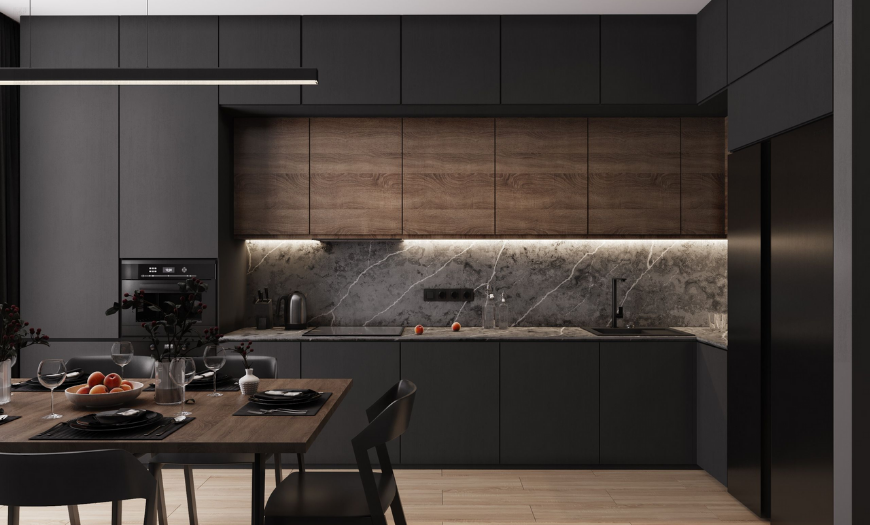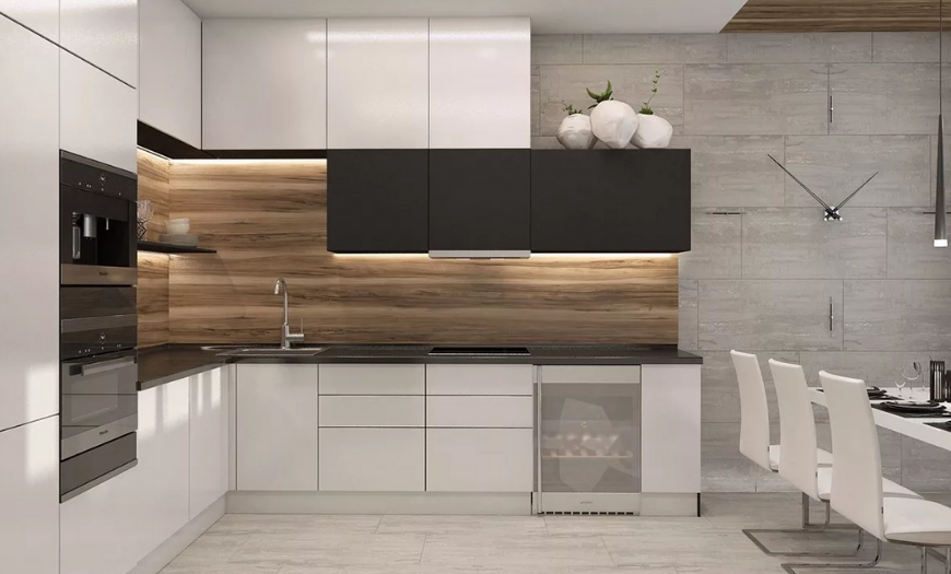 Особо популярны гладкие фасады, где нет ручек, или варианты со скрытой фурнитурой. Простота проявляется в декоре, палитре цветов и формах. Светлые тона преобладают в небольших помещениях. Также в тренде монохромное оформление или бело-серая гамма с контрастными акцентами.