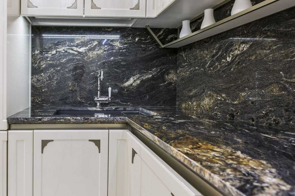 Практичный и объединяющий ход – выложить одинаковой плиткой фартук, плинтуса, торцы мебели и оконные откосы.