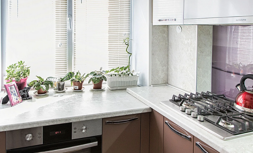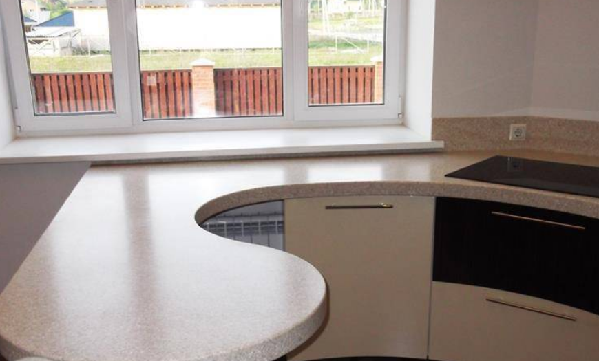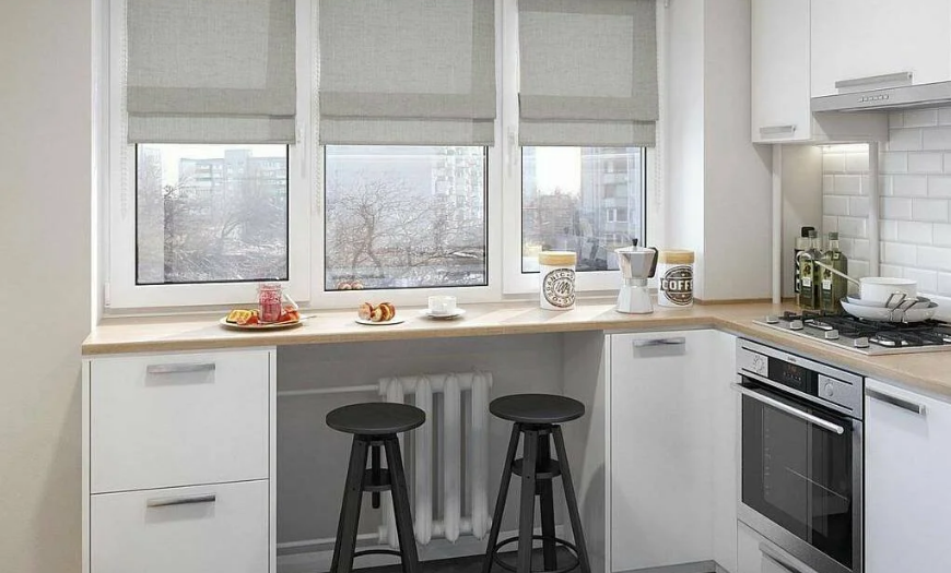 Версия с использованием подоконника как полноценной рабочей поверхности встречается не только в частных домах, но и в квартирах с небольшой площадью кухни. В этой части делают зону для приготовления пищи или устанавливают необходимое оборудование. При этом в хрущевках при таком проектировании иногда не остается площади для планировки обеденной секции. Поэтому можно продолжить столешницу наподобие барной стойки.