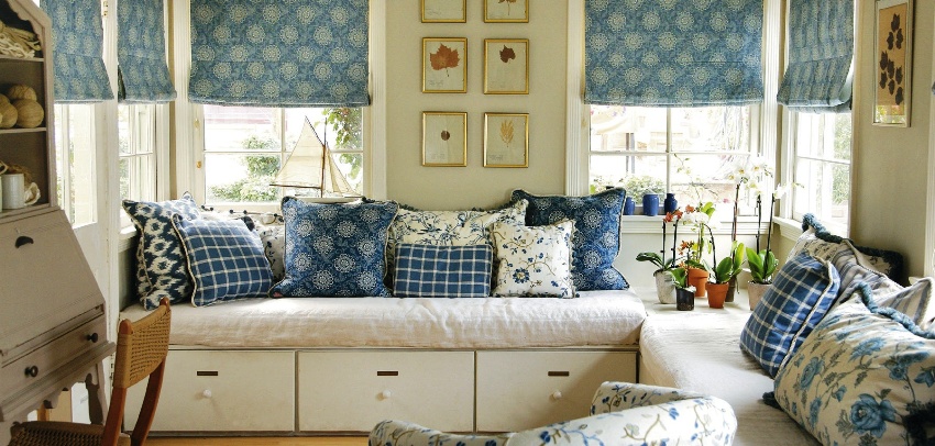 Обивка данной мебели сочетается с принтом обоев и штор, в случае ее отсутствия стоит положить подушечки, но с тем же орнаментом.