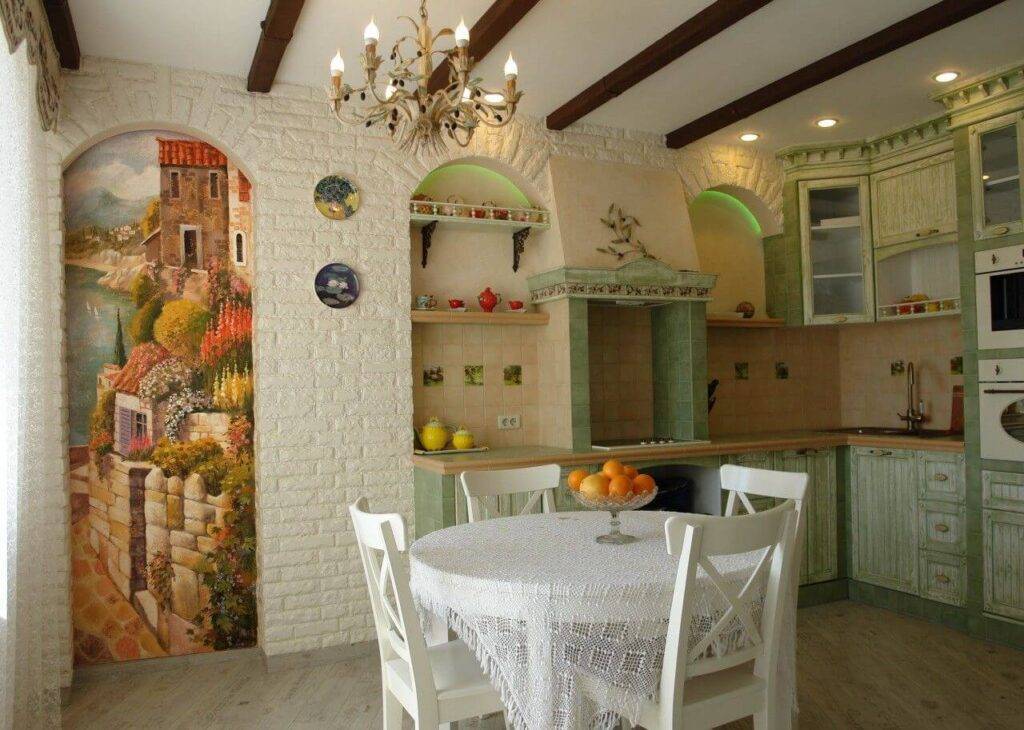 Широкая столешница в мраморном стиле отлично подходит для организации кухни в стиле интерьера прованс. Приветсвтуется гарнитур из натурального дерева, который вдобавок окрашивается в оливковый цвет. Идея оформления интересна тем, что верхняя часть мебели сделана в другом цвете, а оливковая палитра использована лишь для некоторых простенков. Для подобных случаев стараются оформлять фартук заказным кафелем с орнаментами и узорами под старину.