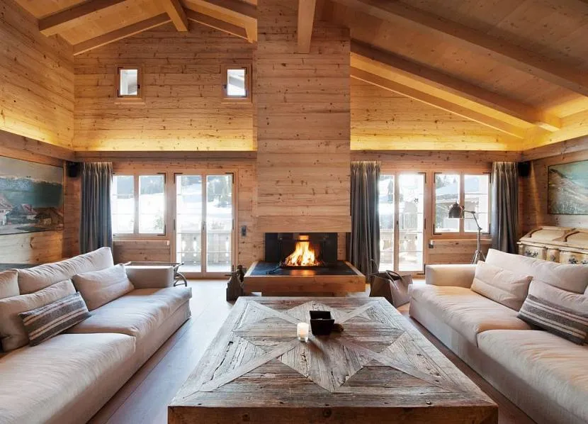 - шале – носит типичные швейцарские черты: массивная простой формы обстановка, обивка из натуральных тканей или кожи, много резьбы по дереву, вполне допускаются кованые детали;