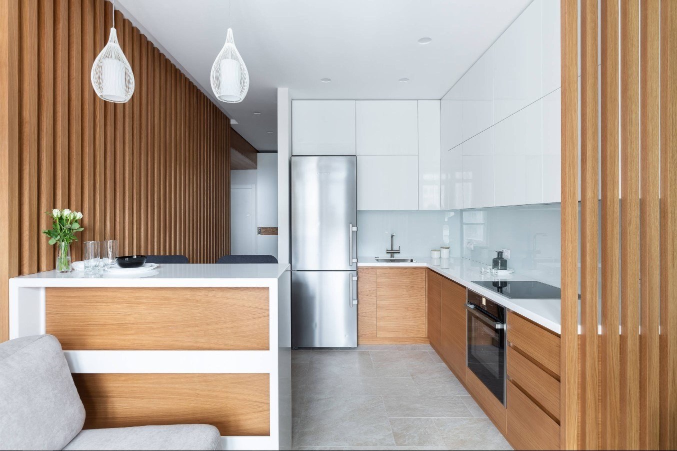 Белая кухня с натуральным деревом: