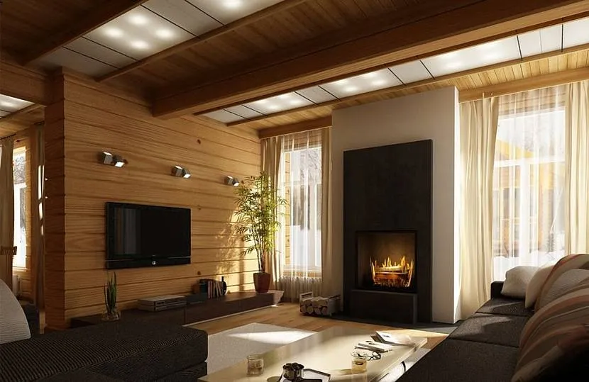 Гостиная с камином в доме из бруса