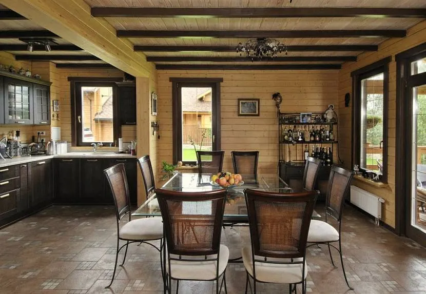 Интерьер кухни, совмещенной со столовой в деревянном доме