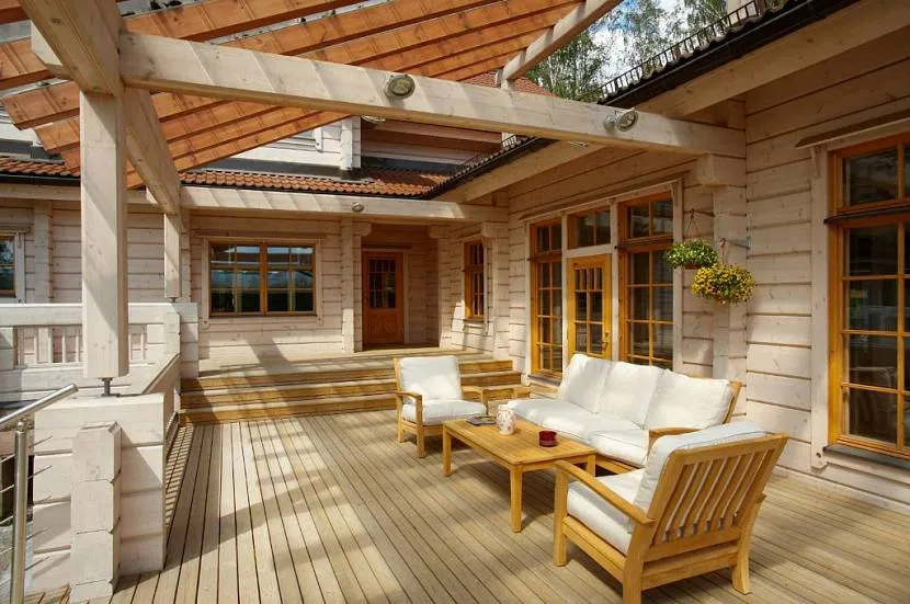 Интерьер открытой террасы в доме из бруса