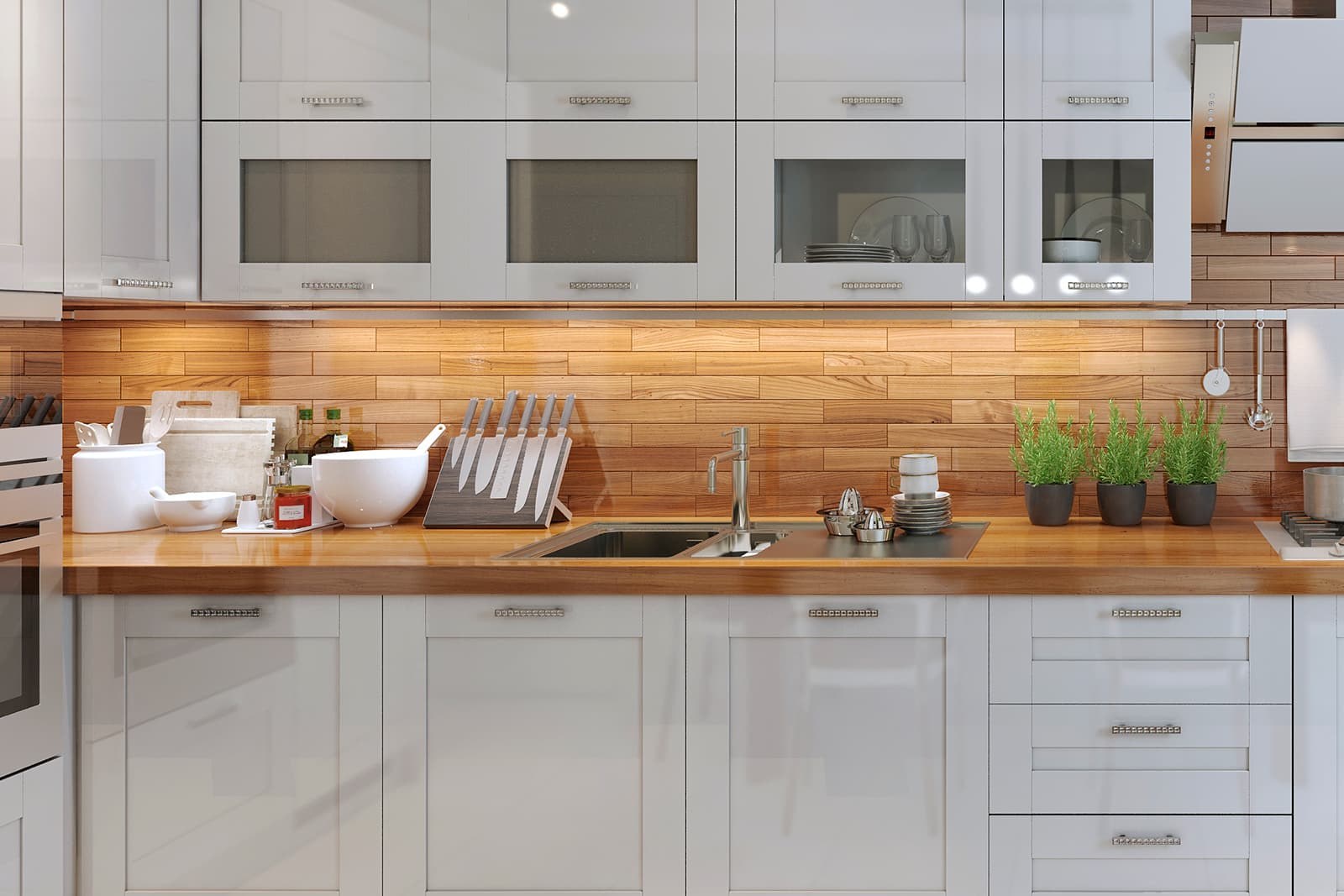 Натуральная древесина богата на оттенки и хорошо вписывается в интерьер разных стилей: классика, хай-тек, прованс, лофт, сканди. Столешница одинаково гармонично сочетается со старинными фрезерованными и минималистичными глянцевыми фасадами.