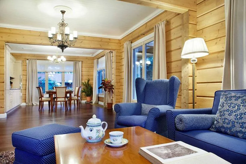 Интерьер гостиной в доме из бруса