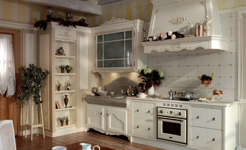 Идеальным дополнением любого кухонного гарнитура в старинном стиле станут резные деревянные полки из массива. Они могут крепиться к стене навесными петлями либо коваными консолями, только подчеркивая стилевую особенность интерьера.