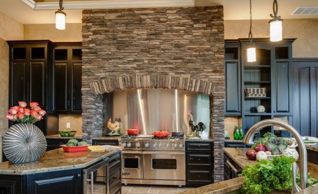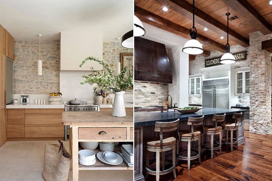 С помощью камня интерьер кухни можно преобразить до неузнаваемости. Природный камень обладает массой преимуществ: он не боится воды, не горит, гигиеничный и почти всегда прост в уходе. Можно использовать мрамор, гранит, сланец, песчаник или любую другую породу камня, которая максимально отвечает конкретной дизайнерской задумке. Но природный камень – это дорогое удовольствие: сам материал и работы по монтажу достаточно недешевые, да еще и весит материал прилично.
