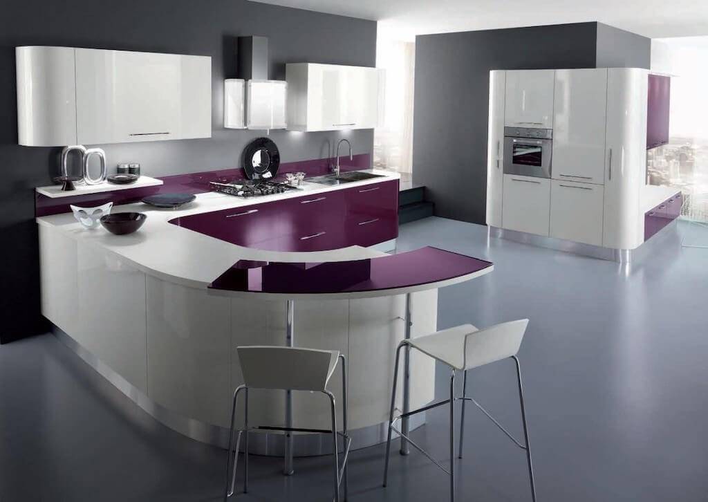 Отличается обилием гладких глянцевых поверхностей и минимальным количеством декора. Чаще всего встречаются двуцветные решения со смежными или контрастными тонами. Гарнитур имеет четкие линии, актуальны прямые и радиусные фасады.