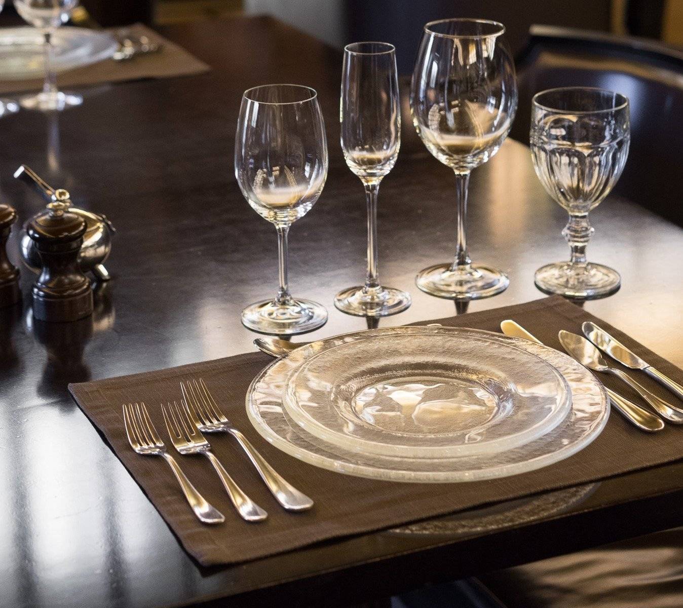 Количество приборов зависит от меню. Праздничное, как правило, включает полный комплект: нож для горячего, нож для рыбы, столовая ложка, нож для закусок, суповая ложка и вилка для устриц (это единственный вид вилок, который можно располагать справа). Слева раскладывают вилки: для горячего, для рыбы и для закусок.