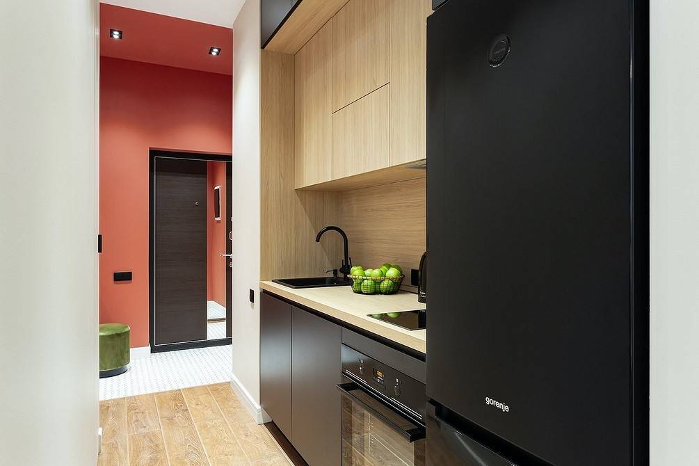 Если в студии комната слишком мала, то аккуратная кухня-ниша в коридоре решит проблему с обустройством зоны готовки. Есть и совсем компактные варианты углубления в стене, как на первом фото.