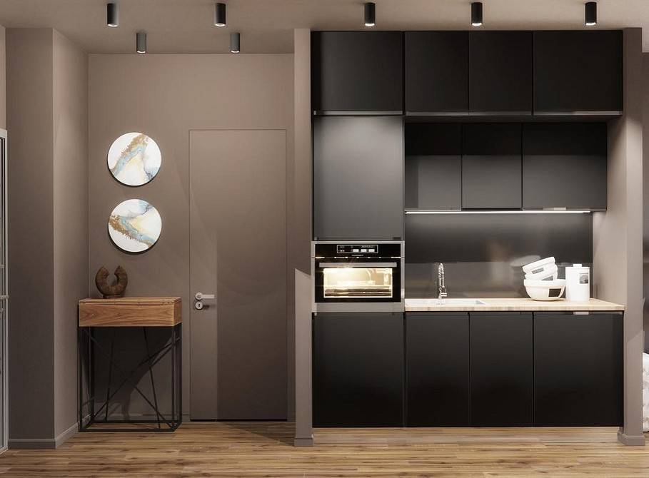 Часто в квартирах предусмотрены кладовые, гардеробные и другие подсобные небольшие помещения. Один из интересных вариантов использования такой вспомогательной площади — обустроить там кухонное пространство (помните правила — площадь не меньше 5 кв. м, у соседей снизу в этом месте — нежилое помещение, а у соседей сверху — нет мокрых зон).