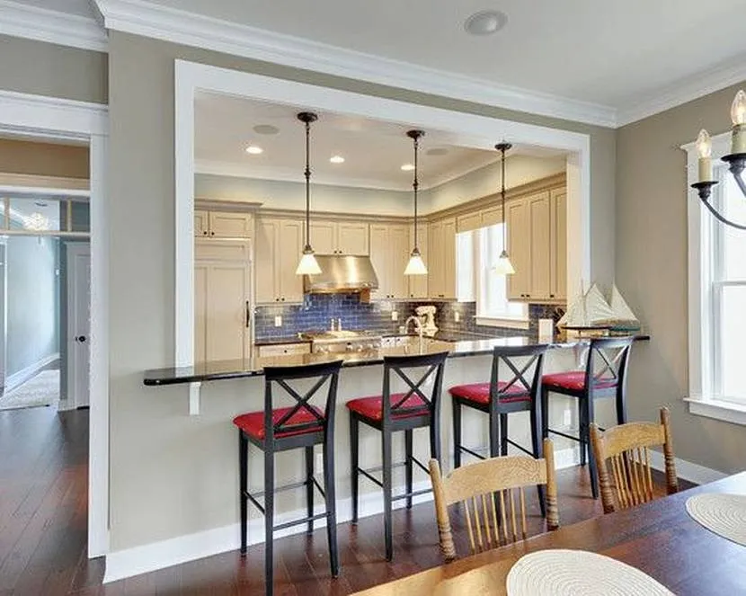 Открытый проем. Саамы простой и бюджетный способ, обеспечивающий нужную инсоляцию и циркуляцию воздуха. Подходит, если готовка для вас лишь хобби, или если вы озаботились установкой мощной вытяжки в зоне готовки. Иногда проем оформляется в виде арки, что актуально в некоторых дизайнерских стилях.